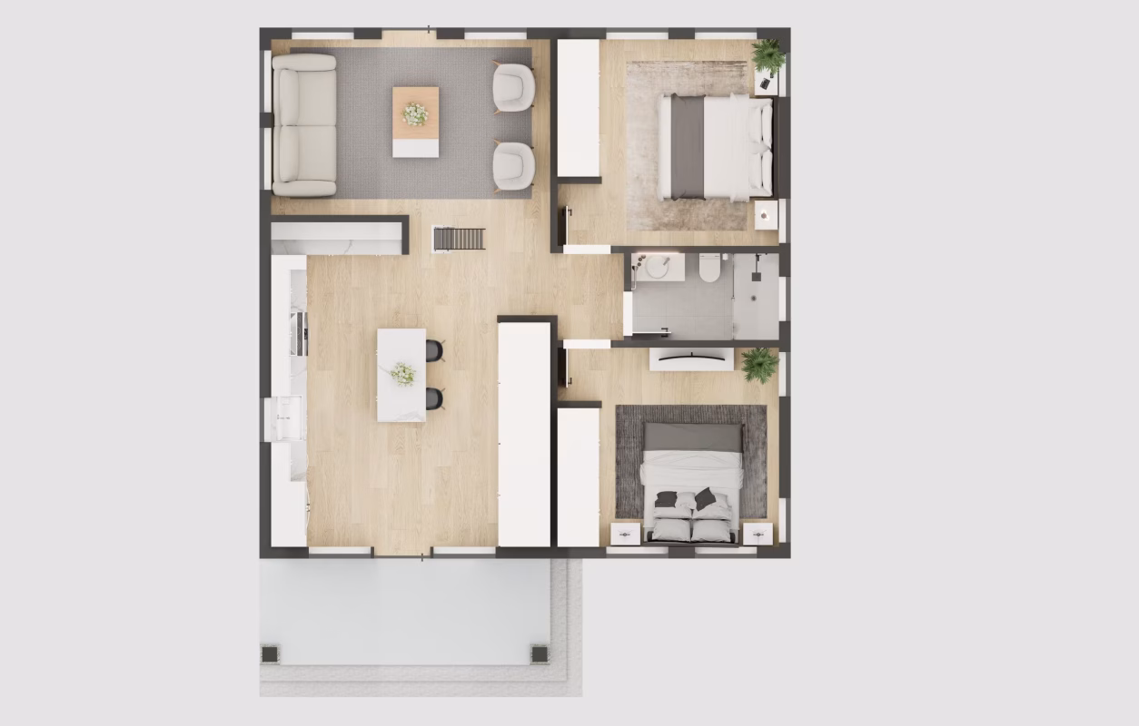 Two bedrooms with a central bath and open-plan kitchen/living/dining hub. Includes laundry and built-in storage for efficient everyday living.